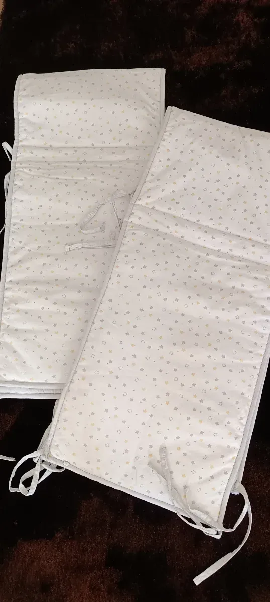 Detalles del productoProtector de cuna con estampado de estrellas en tonos grises y amarillos.