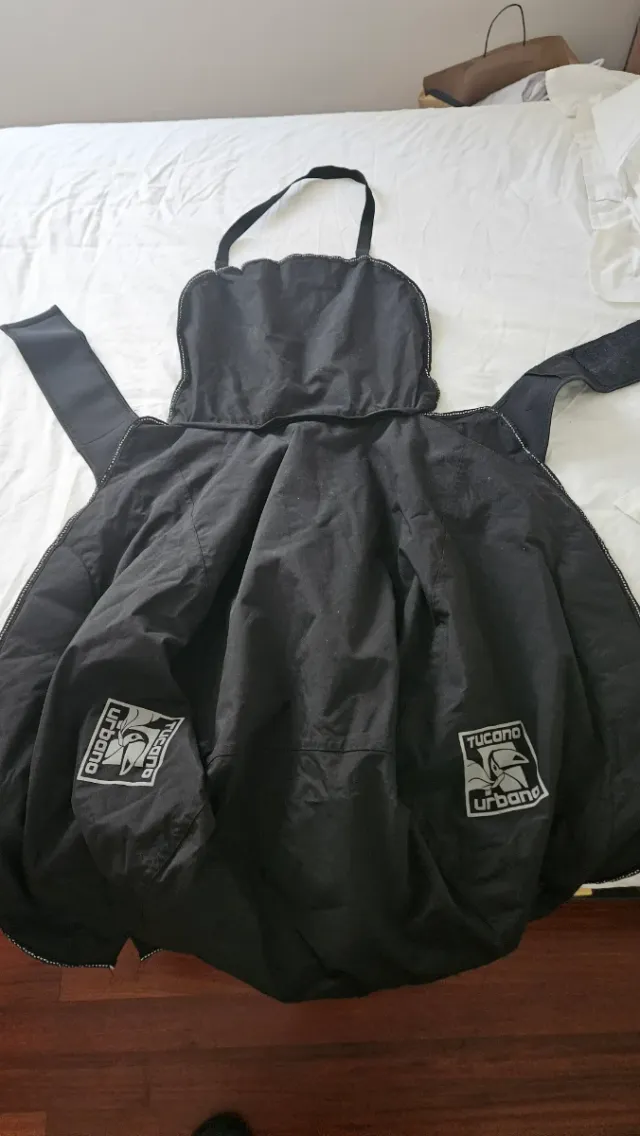 Protector de piernas Tucano Urbano en color negro. Como nuevo. - Diseño acolchado. - Cierre ajustable. - Logo de la marca en los laterales.