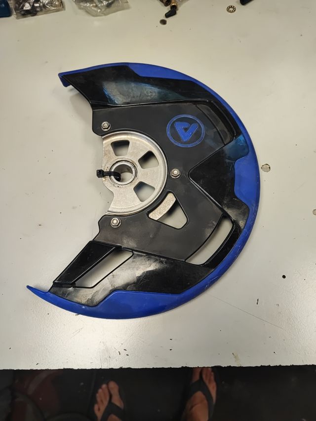 Protector de disco delantero para Yamaha WR. Color azul y negro. En buen estado - Diseño robusto. - Incluye soporte metálico. Para eje de 20mm