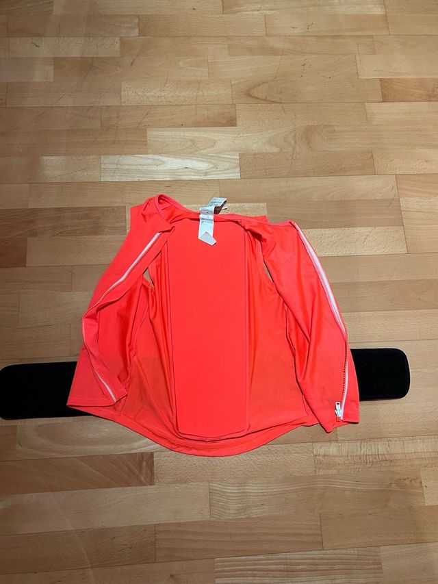 Protector de espalda tipo tortuga para esquí, de Decathlon. - Color naranja fluorescente. - Cremallera frontal. - Diseño ergonómico.