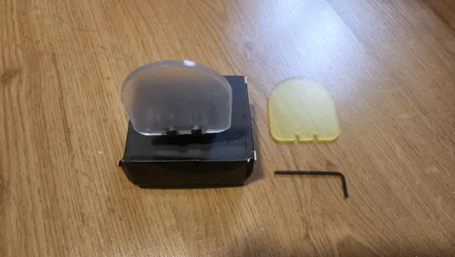 Protector de mira para airsoft. Incluye un protector transparente y uno amarillo. - Protector transparente. - Protector amarillo. - Llave Allen incluida.
