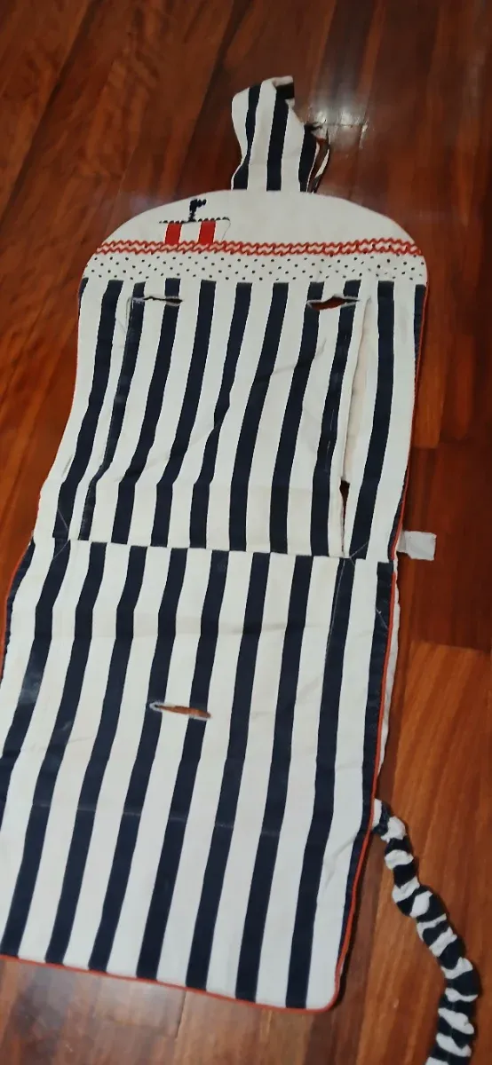 Detalles del productoProtector para silla de paseo con un diseño de rayas azules y blancas. Incluye un detalle bordado en la parte superior.
