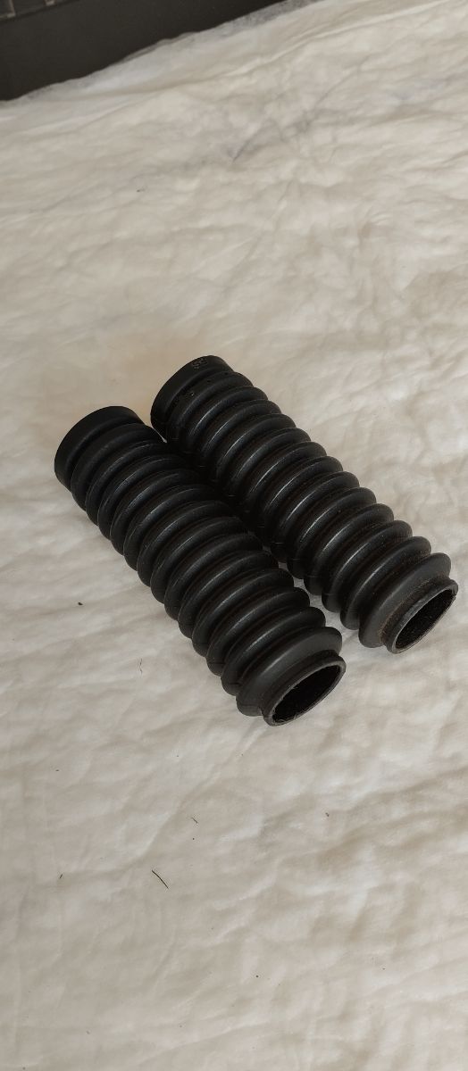 Detalles del productoSe venden dos protectores para horquilla de bicicleta. Son de color negro y parecen estar en buen estado, aunque presentan algunas marcas de uso.