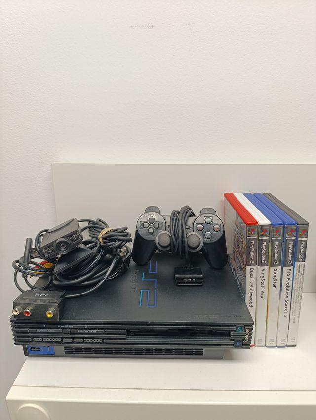- PlayStation 2. - Un mando. - Una cámara. - Cinco juegos. - Adaptador. - Todos los cables necesarios.