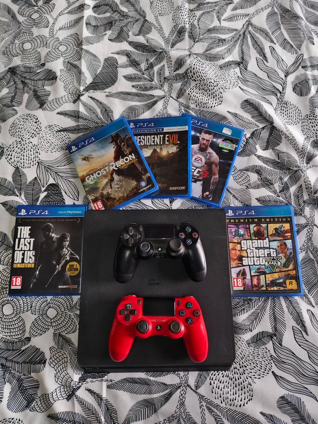 PS4 (PlayStation 4) con 2 mandos y 5 juegos