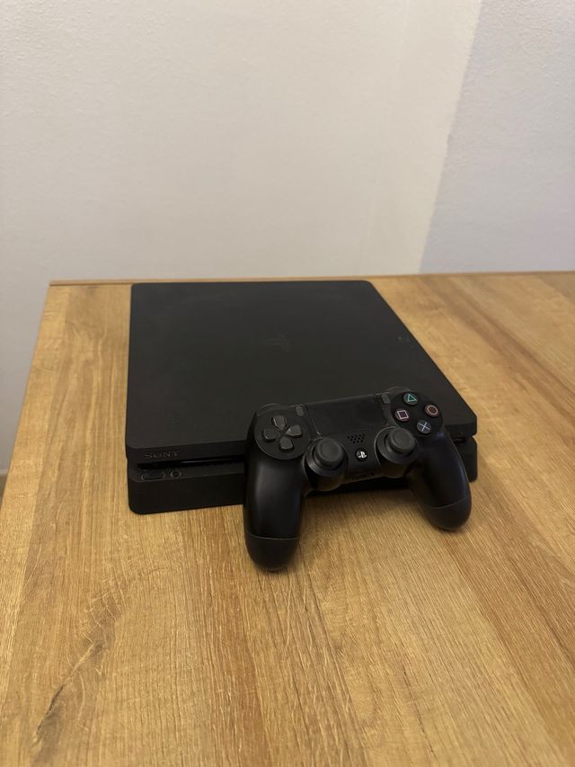 Consola PlayStation 4 Slim en color negro con disco duro de 1TB. Incluye un mando.