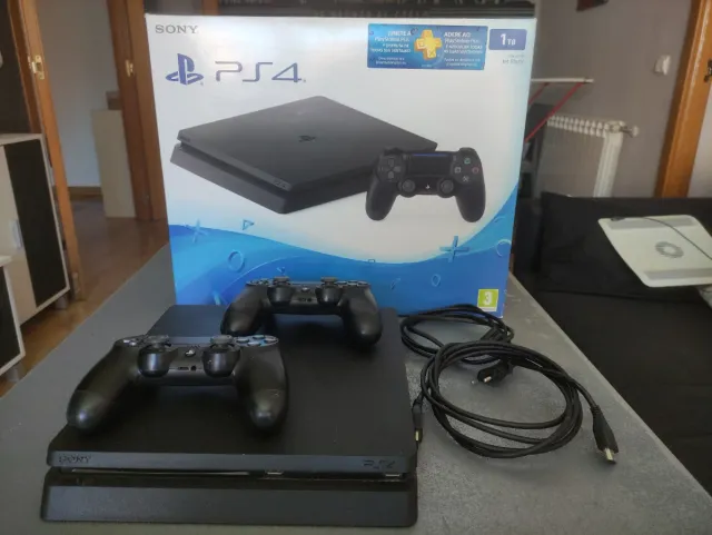 Consola PlayStation 4 Slim en color negro con 1TB de almacenamiento. Incluye dos mandos DualShock 4.