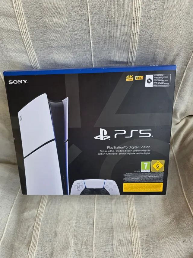 Caja original de la PlayStation 5 Digital Edition. - Incluye la consola. - Mando DualSense. - Cables y manuales.