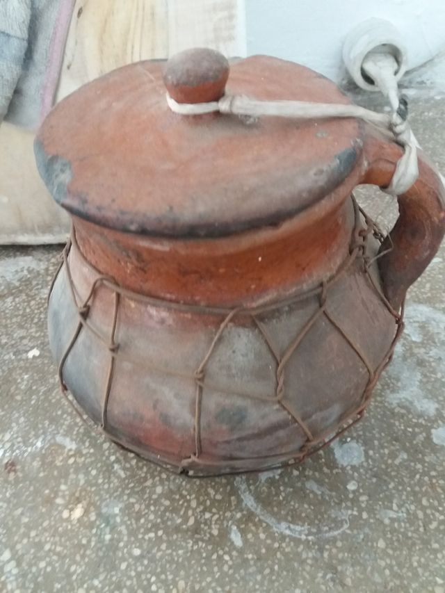 puchero con tapa y forrado de alambre no es muy grande mas bien pequeño.