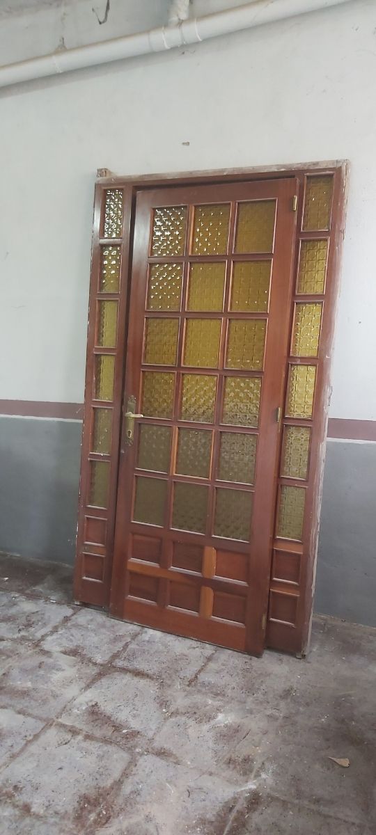 Puerta de madera maciza y con cristales para dejar pasar la luz. Las medidas de la puerta son 0,82 m de ancha, y 2,12 de alta.Y el marcó exterior 1,27 de ancho, y 2,12 de alto.