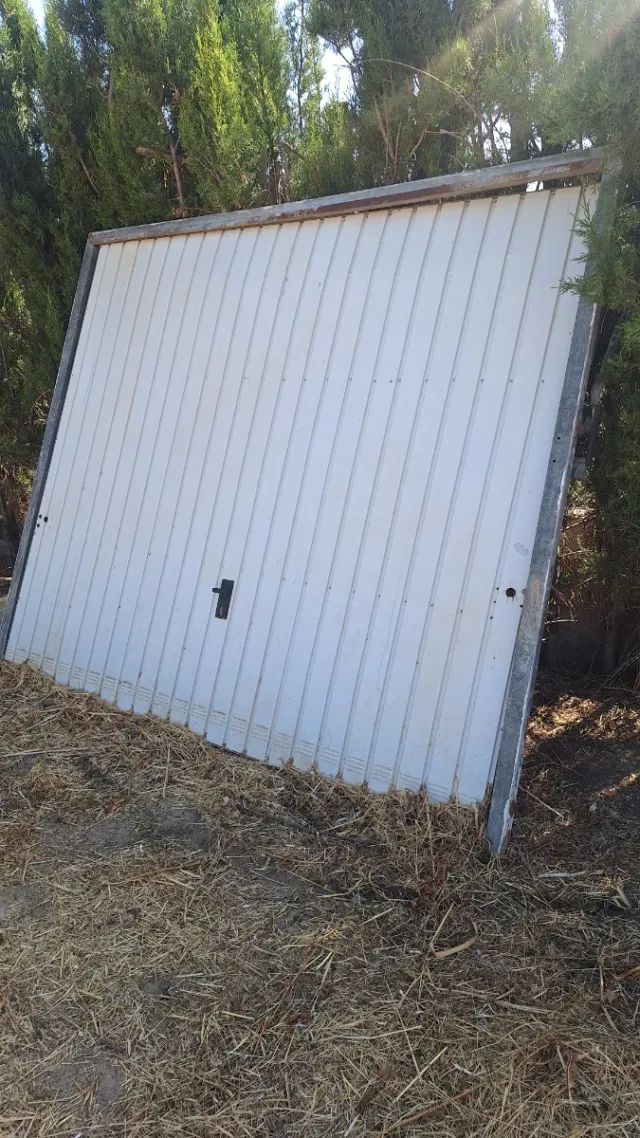 Puerta abatible de garaje de color blanco. Recoger. - Panelado vertical. - Marco metálico.