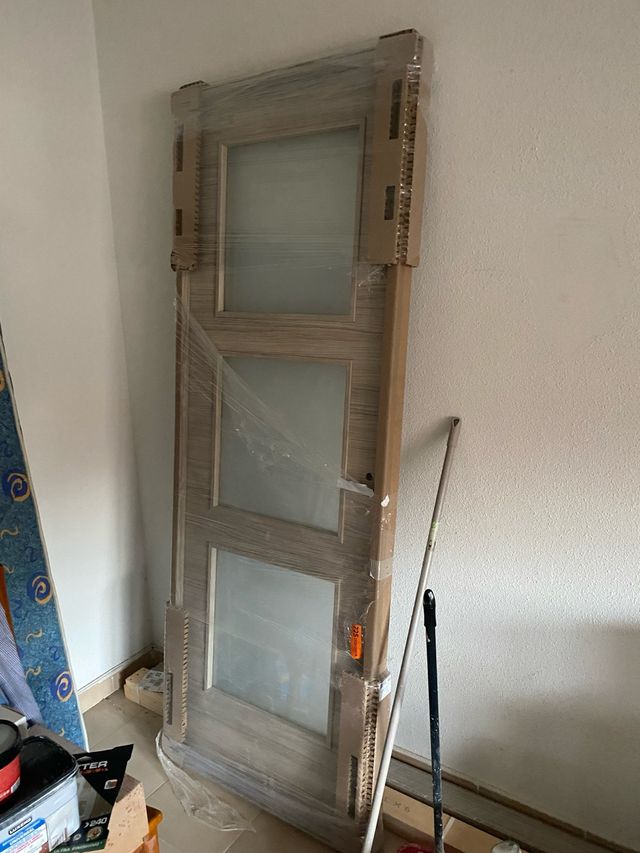 Detalles del productoPuerta de interior abatible con diseño vidriado y paneles de cristal.