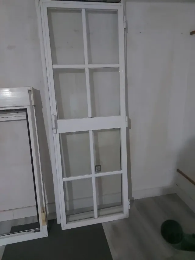 Puerta de aluminio en color blanco con medidas de 77x210 cm. - Marco de aluminio. - Paneles de vidrio. - Diseño con divisiones.