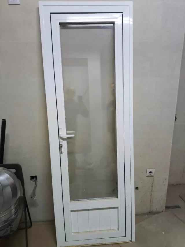 Puerta de aluminio con un panel de cristal y un panel inferior de lamas. - Marco y puerta de aluminio blanco. - Panel de cristal. - Panel inferior de lamas. 207 x72