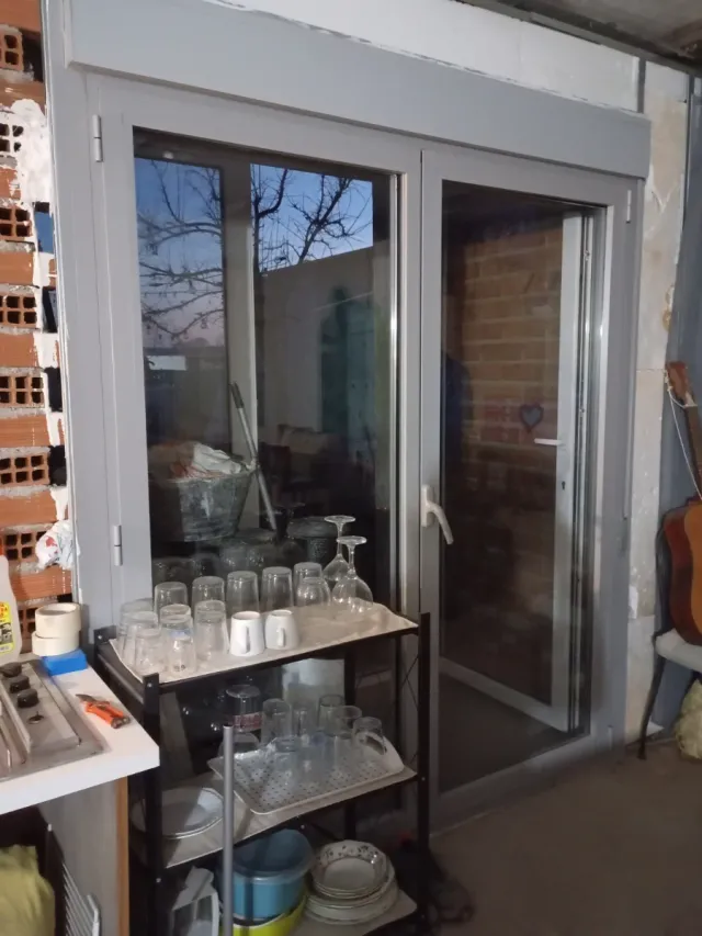Puerta de aluminio con dos hojas oscilobatientes. - Material: Aluminio. - Diseño: Oscilobatiente. - Número de hojas: 2. Ancho 196 cm alto 227 cm