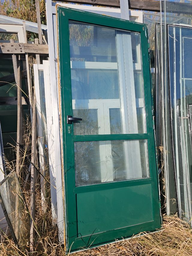Vendo esta puerta de aluminio color verde con panel inferior. Lleva cristal climalit y maneta a los 2 lados. Alto 208 Ancho 95 180 euros