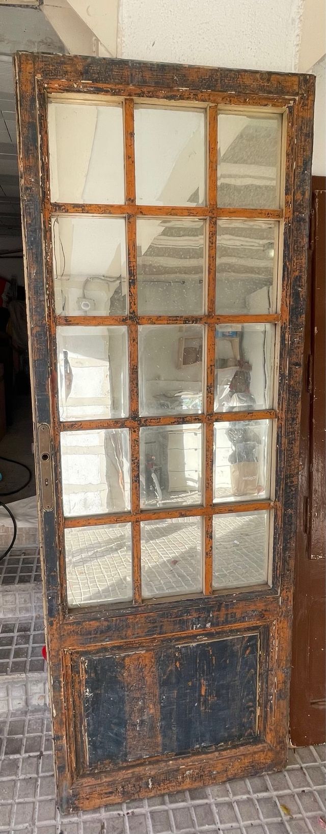 Detalles del productoPuerta decorativa de madera con múltiples cristales/espejos.