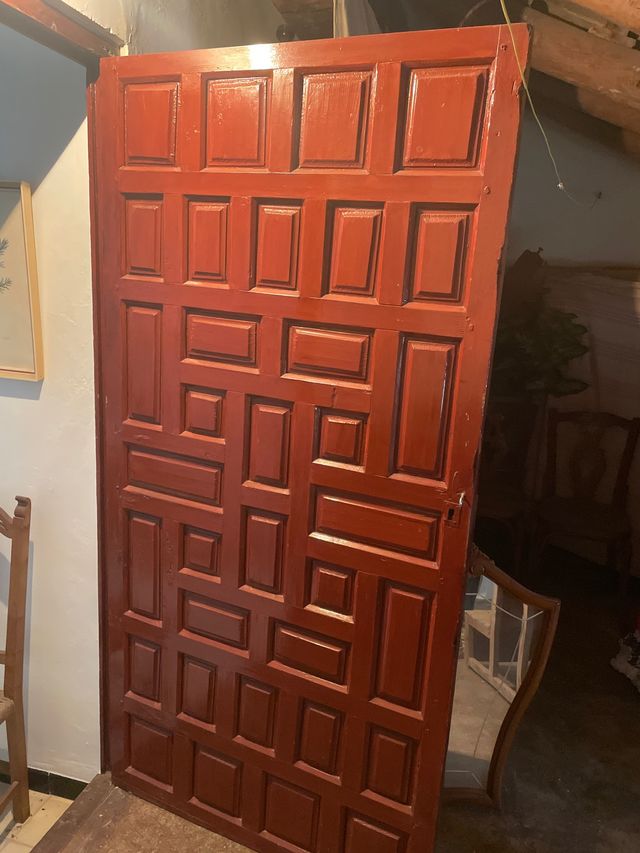 Detalles del productoPuerta antigua de madera con un diseño de paneles tallados. Su color rojo le da un toque rústico y distintivo.