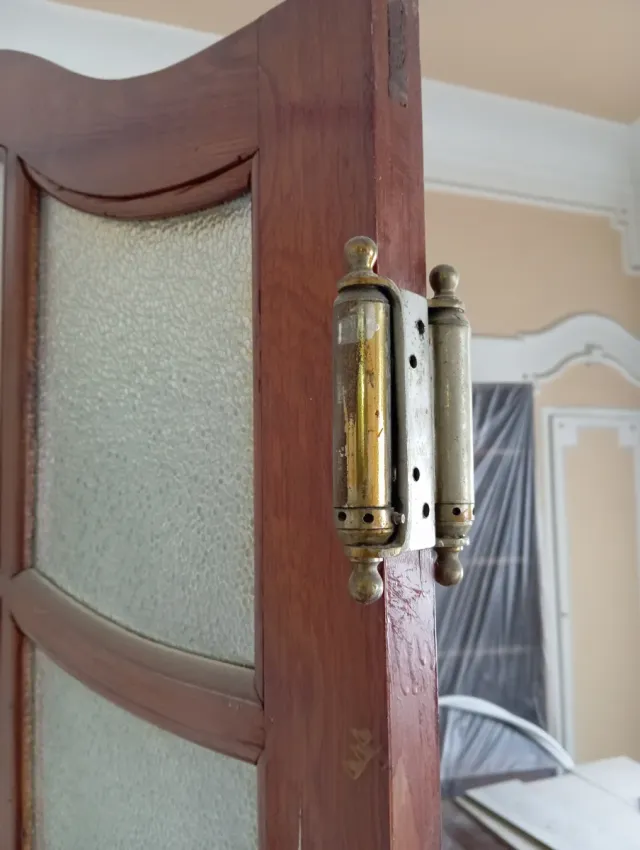 Detalles del productoPuerta de madera maciza con detalles de cristal esmerilado, original de los años 40. Un elemento con carácter para tu hogar. Con bisagras de resorte doble y madera de mobila