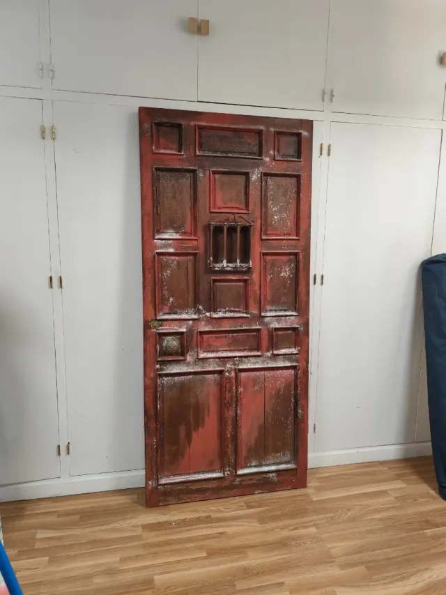 Detalles del productoPuerta antigua con un diseño único y un acabado desgastado en color rojo debido a que la hemos utilizado para un de decorado de fotografía.