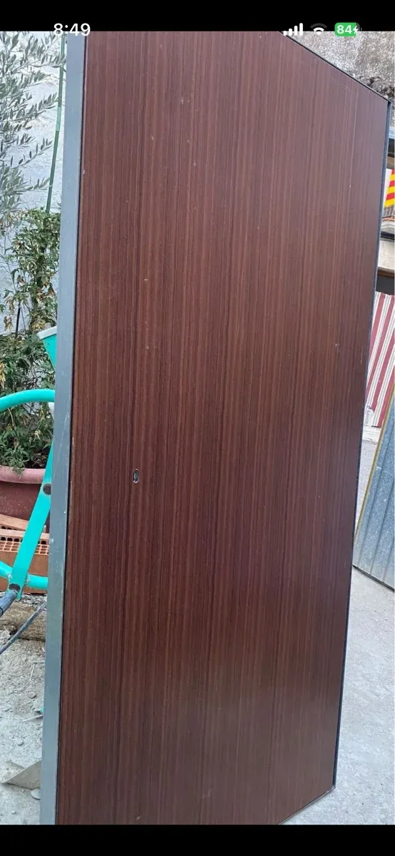 Puerta de seguridad con acabado en madera y marco metálico. - Diseño de madera con veta vertical. - Marco exterior de metal gris.