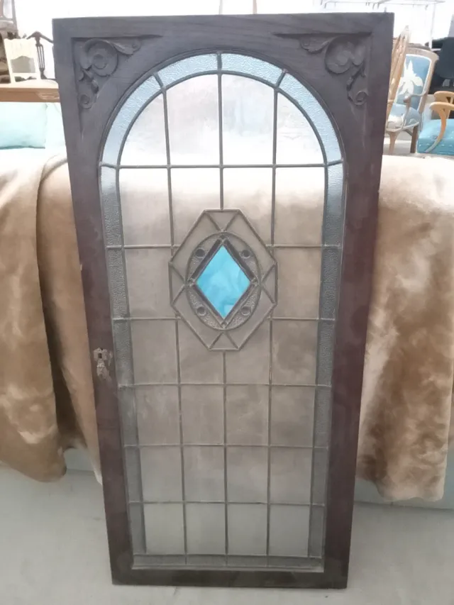 Detalles del productoPuerta antigua de madera de castaño con vidriera.