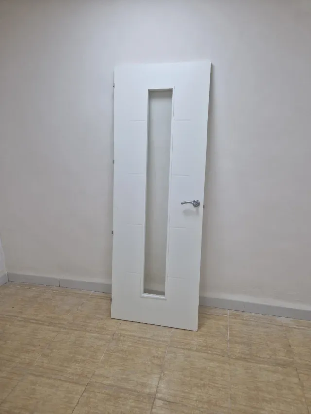 Puerta interior de color blanco con un panel de cristal. - Diseño moderno con líneas horizontales. - Panel central de cristal translúcido. -Medida 202,5×72,5