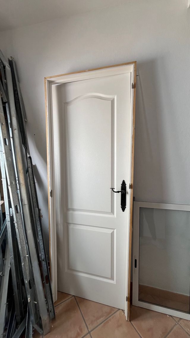 Puerta de interior blanca con premarco de madera. - Diseño clásico de dos paneles. - Tirador negro incluido. - Lista para instalar.
