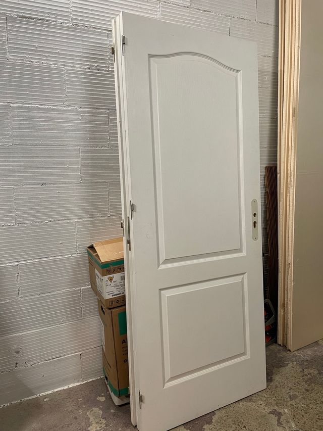 Detalles del productoPuerta interior de madera lacada en blanco. Presenta un diseño clásico con dos paneles moldurados.