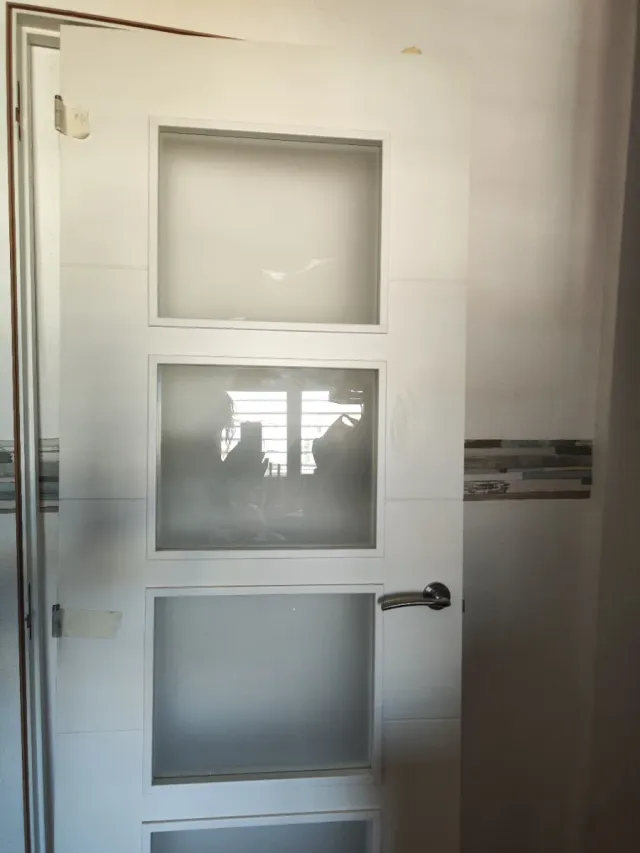 Detalles del productoPuerta lacada en blanco, con un diseño moderno de tres paneles de cristal.