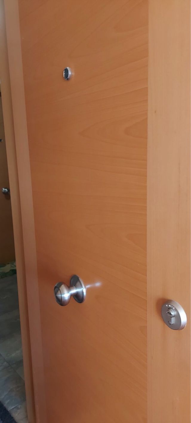 Puerta blindada de madera. - Incluye mirilla. - Cerradura de seguridad. - Pomo metálico.