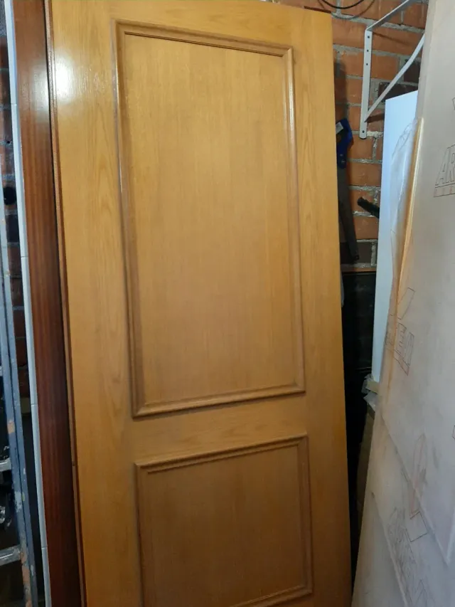 Detalles del productoPuerta de entrada de madera con un diseño clásico de dos paneles.