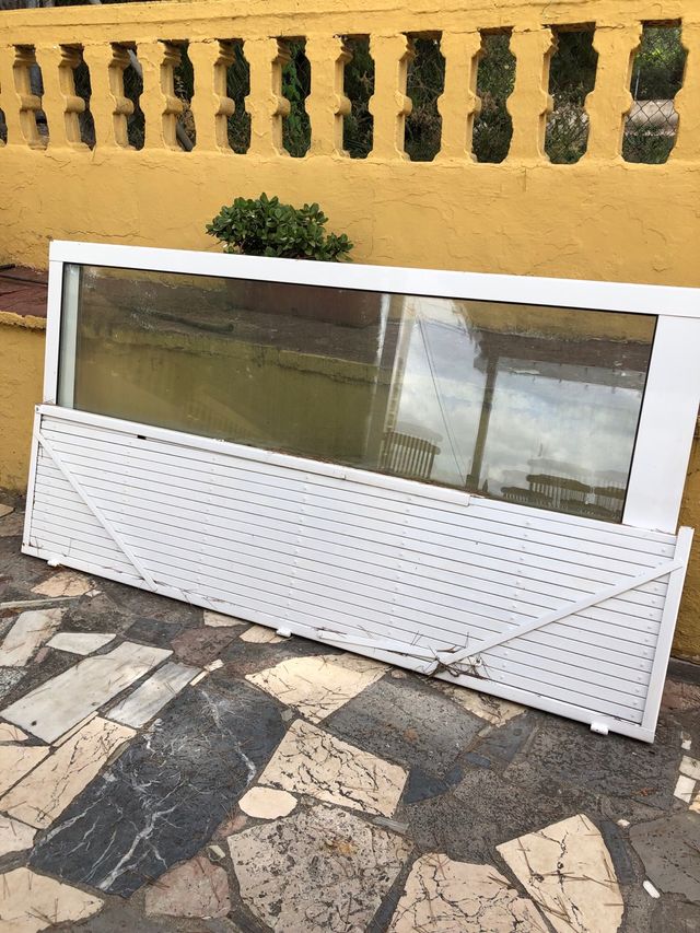 Detalles del productoPuerta corredera de aluminio blanco, de aproximadamente 2x2 metros. Está en buen estado.