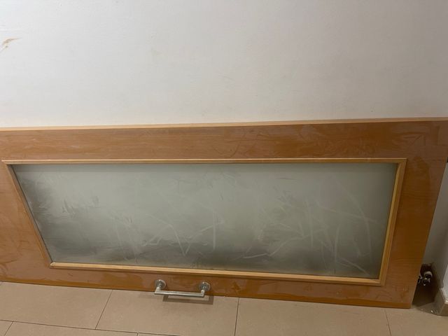 Puerta corredera de madera con un panel de cristal. - Marco de madera color natural. - Panel de cristal translúcido. - Tirador metálico.