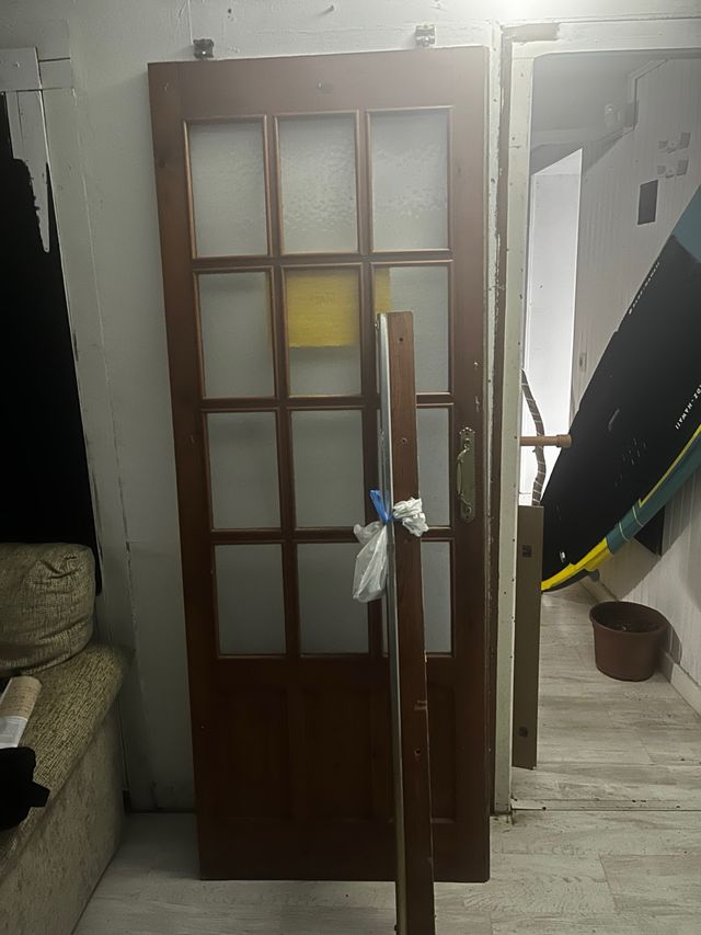 Puerta corredera de madera con paneles de cristal. - Diseño con 9 paneles de cristal esmerilado. - Marco de madera oscura.