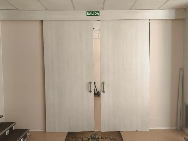 Puerta corredera doble con acabado en madera clara. Ideal para separar ambientes o como entrada principal. Diseño moderno y elegante. Medidas: 2'59 alto / 1'12 ancho