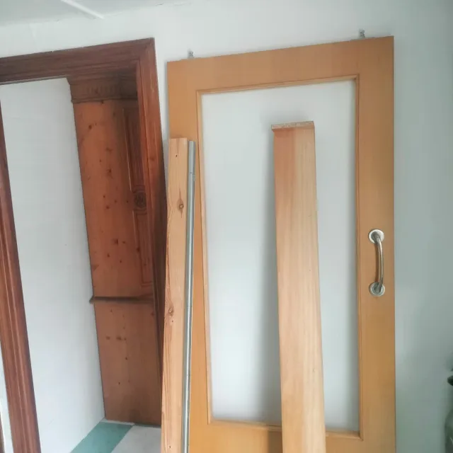 Detalles del productoPuerta corredera de madera maciza con un panel de cristal.
