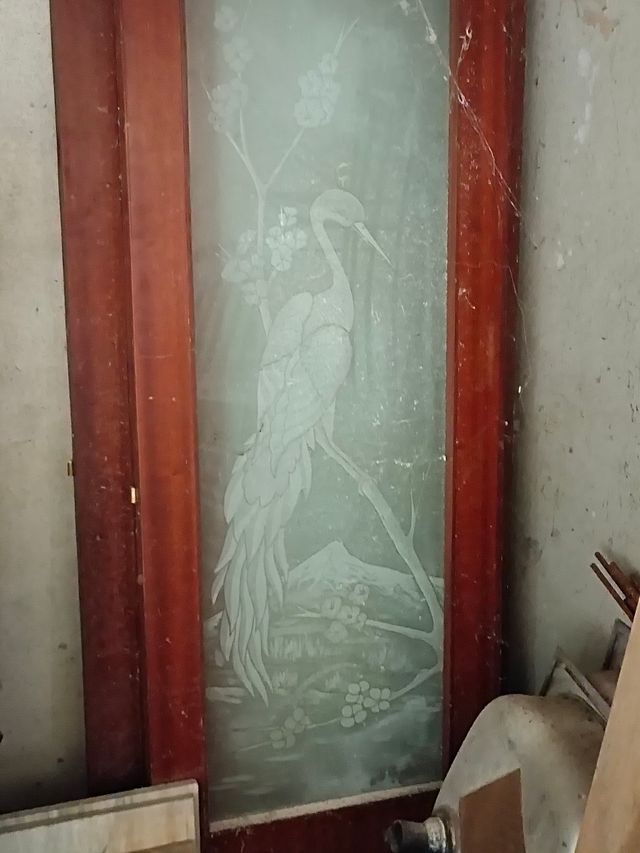 Detalles del productoPreciosa puerta de cristal con marco de madera, diseño vintage con una garza grabada. Ideal para dar un toque único a tu hogar.