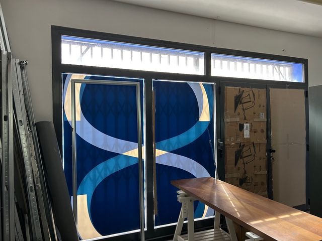 Puerta de aluminio gris y cristal con puerta batiente doble hoja (es la tapada por los cartones)