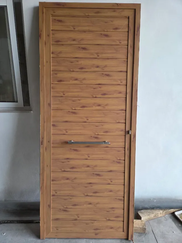 Detalles del productoPuerta de aluminio con acabado imitación madera en tono marrón. Ideal para interiores o exteriores.