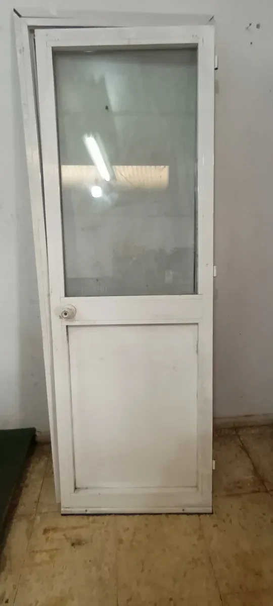 Detalles del productoPuerta de aluminio con un panel de cristal en la parte superior y un panel opaco en la inferior. Cuenta con un pomo.