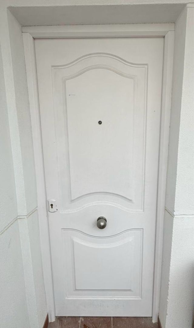 Puerta de calle de color blanco. Diseño clásico con detalles. - Acabado liso. - Pomo metálico. - Mirilla incorporada.
