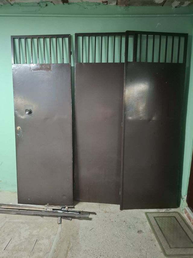 Puerta de cochera metálica de color marrón oscuro. Ideal para garajes o accesos. - Estructura robusta. - Diseño con rejas superiores.