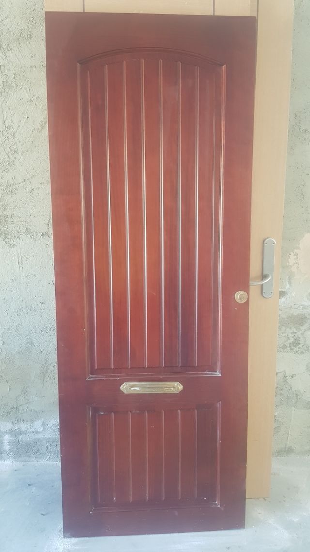 Detalles del productoPuerta de madera tintadas en nogal. Viene con cerradura y sus llaves totalmente funcionales. Trae marco desmontado con bisagras y tapajuntas. Medidas del producto