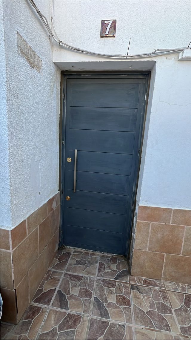 Puerta de entrada con diseño moderno. - Tirador metálico largo. - Cerradura y pomo. - Diseño con líneas horizontales.