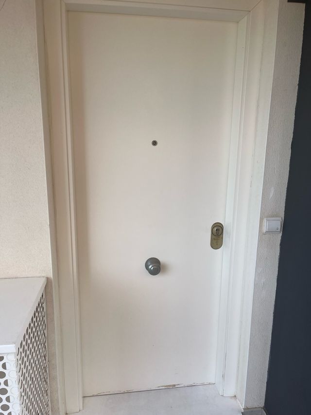 Puerta de entrada de color blanco. - Incluye mirilla. - Pomos y cerradura plateada Se vende por cambio de modelo, en buen estado
