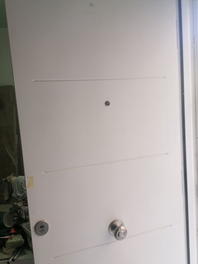 La puerta es igual que la primera y segunda foto y va completa con pomo, mirilla, juego de 5 llaves y manilla.