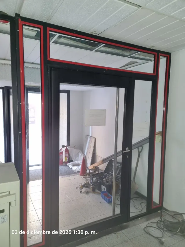 Detalles del productoPuerta de entrada con marco de aluminio negro y detalles rojos.