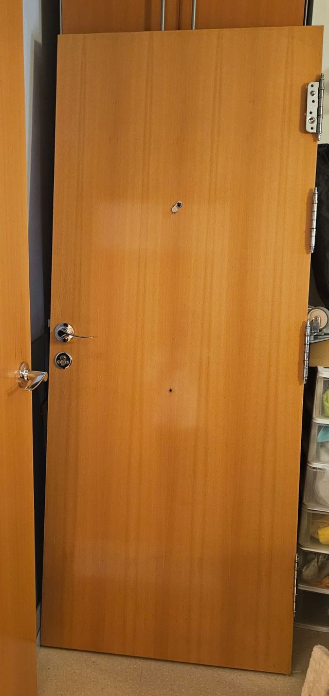 Incluye cerradura de seguridad TESA original con 4 llaves, mirilla instalada y pomo cromado nuevo.
