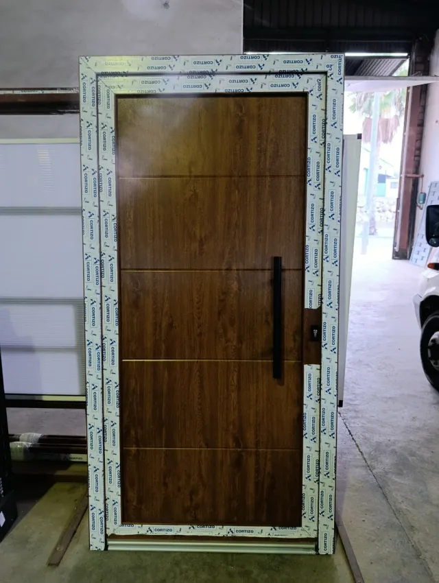 Detalles del productoPuerta de entrada para vivienda con un diseño moderno y elegante. Su acabado imita la madera, aportando calidez y estilo.